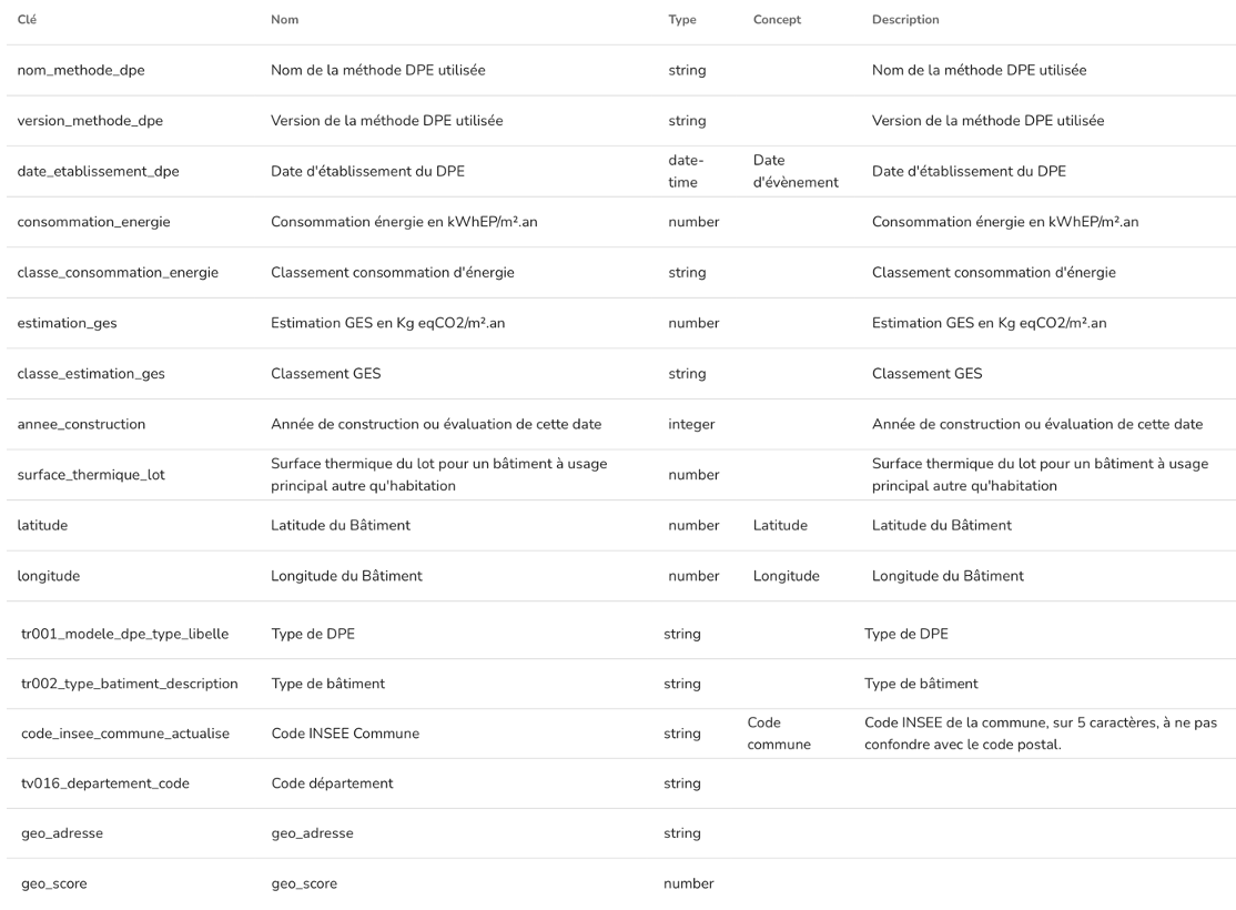 • Statistiques nationales et régionales : Il fournit des statistiques détaillées sur la répartition des étiquettes énergétiques (de A à G), la consommation énergétique moyenne des logements, les émissions de gaz à effet de serre, et les caractéristiques des bâtiments (type de chauffage, isolation, etc.).